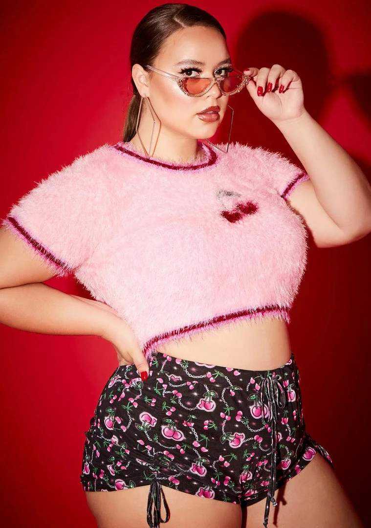 cuz you know your self worth. Be berry cute in this cropped top that has a fuzzy feel and cherry print.