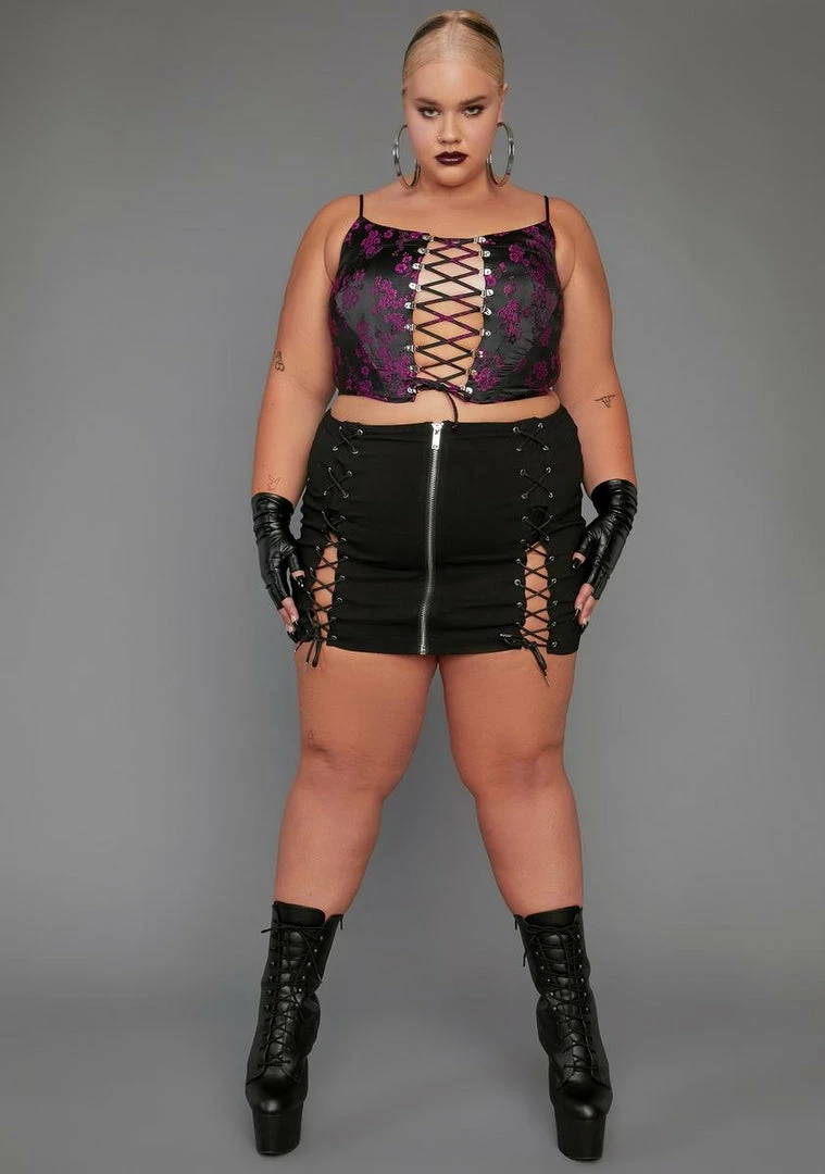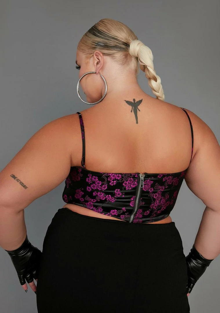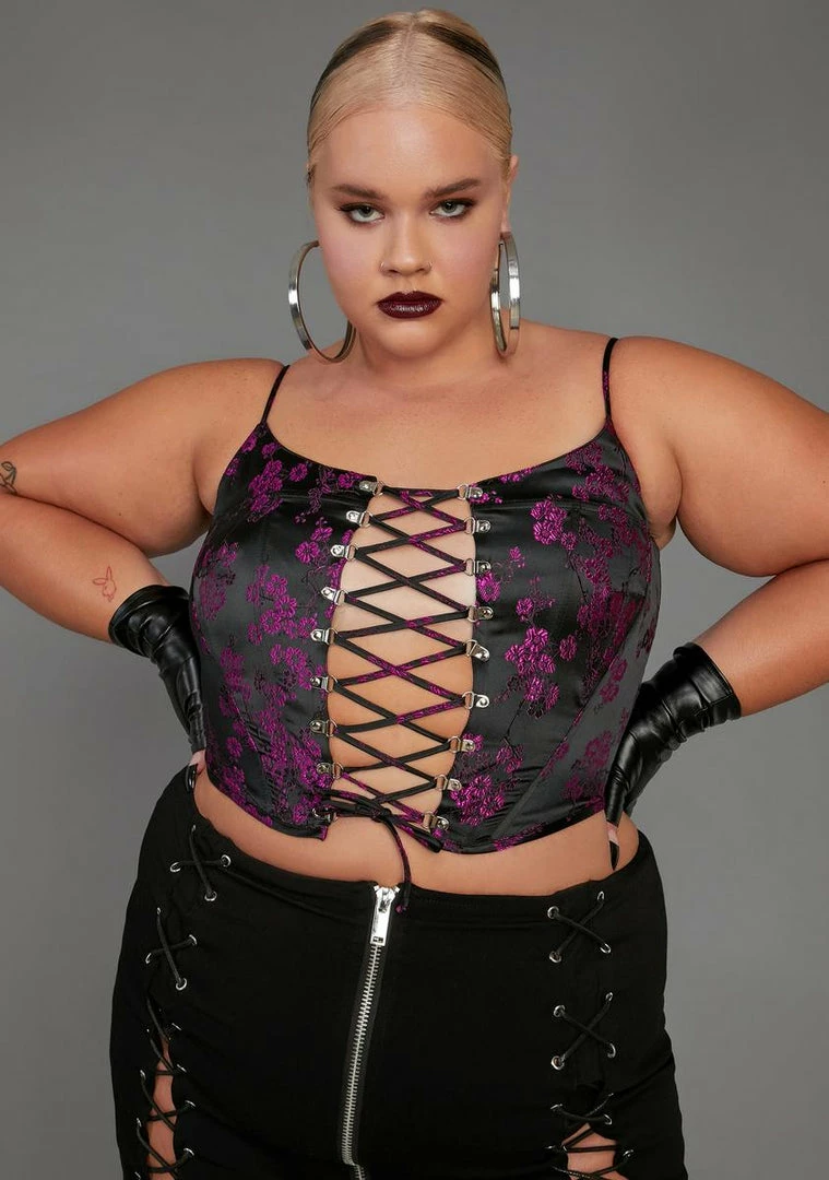 you’re making bank on the gram. Climb your way up the social ladder in this corset tank that has a cherry blossom brocade print, a lace up front with silver hook hardware, and a back zip closure.