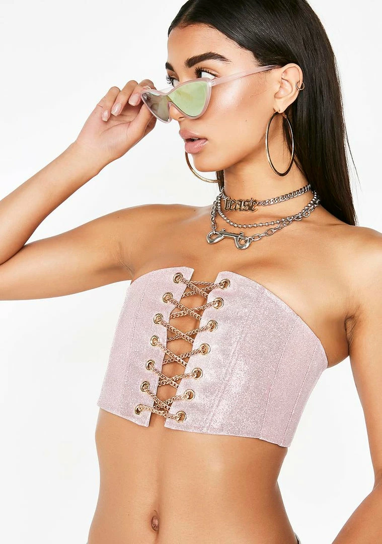 cuz youâre the number one stunna babe! Stay internationally known in this sassy glitter corset top that has gold-chain lace up deetz on the front, a back zip closure Nâ can be worn around the waist as a corset.