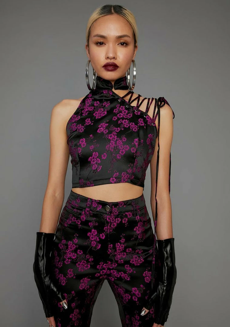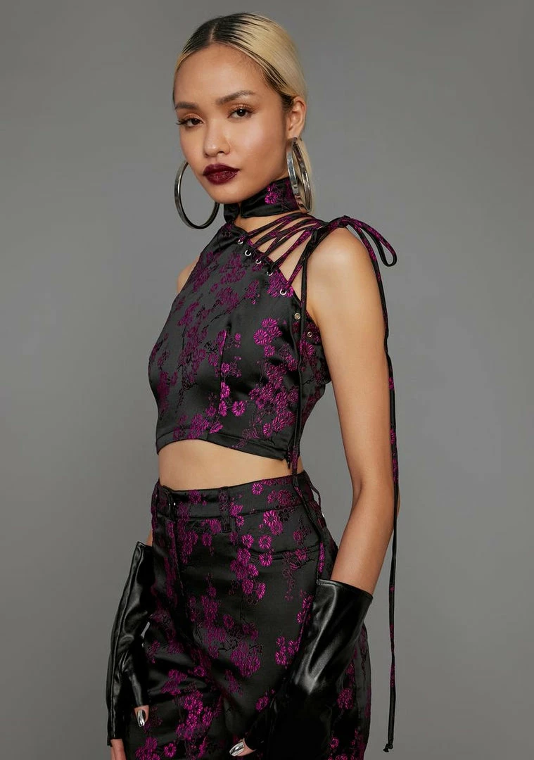you’re making bank on the gram. Climb your way up the social ladder in crop top tha that has a mock neckline, a lace up shoulder with grommet hardware, and a cherry blossom print all over.