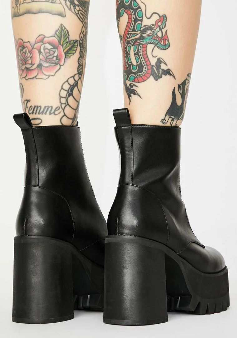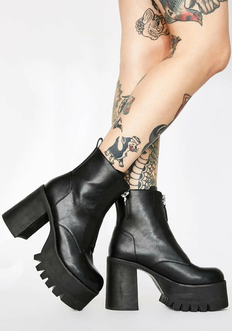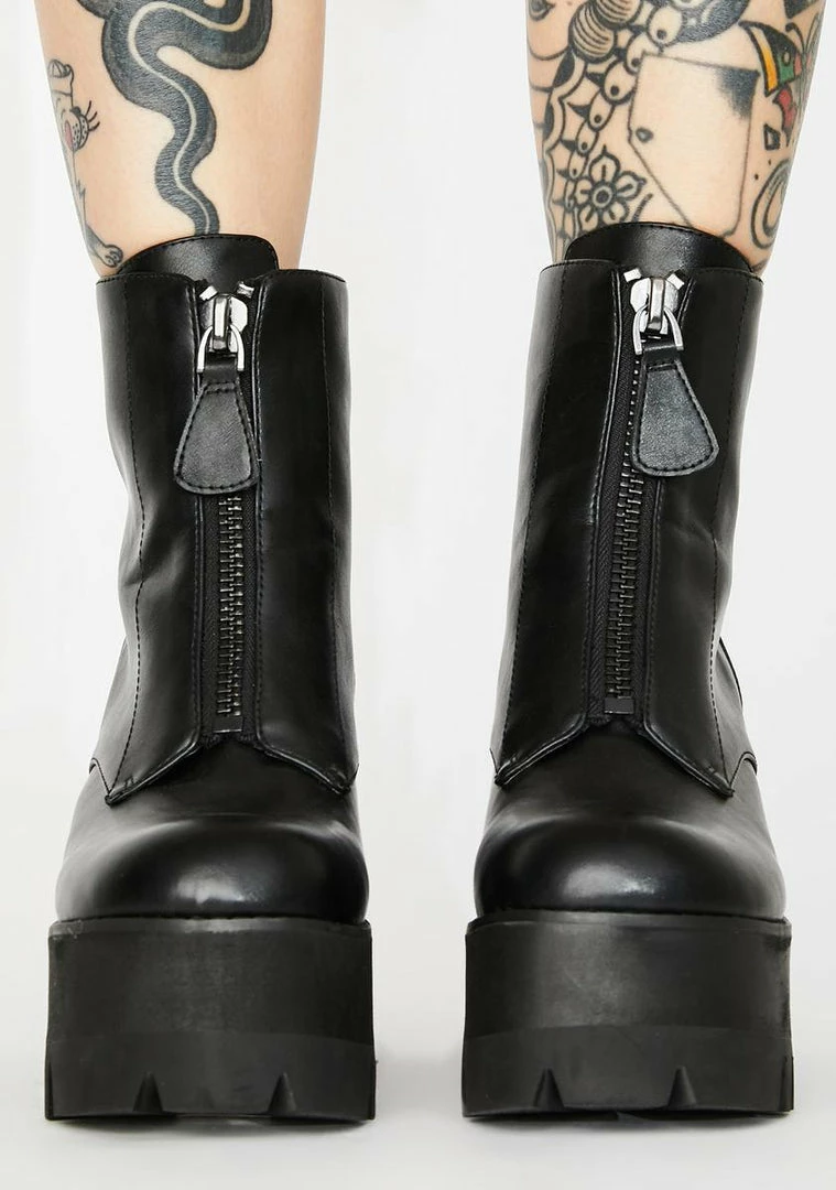 cuz youâre the realest on the block! Keep it one-hundred in these vegan leather platform boots that have chunky block heels, thicc cleated soles Nâ front zip closures.