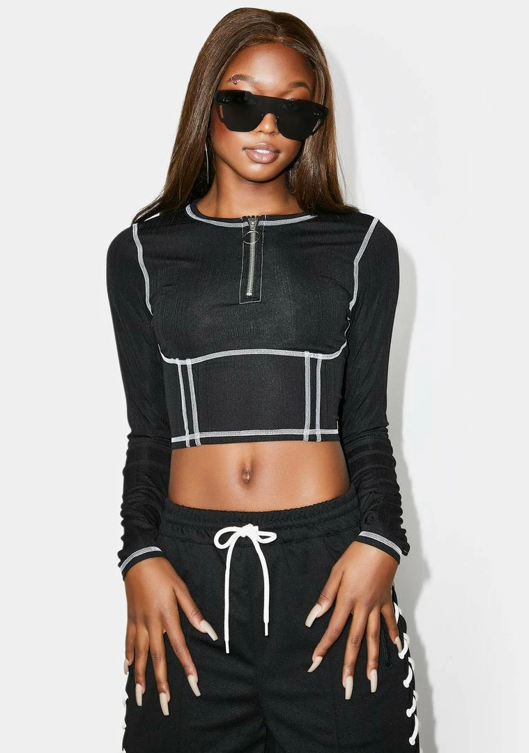 cuz thatâs just how it werks around here, hun. Send âem home with an empty wallet in this hot AF long sleeve crop top that has exposed contrast stitching, a sikk cut-out in the back and O-ring zip closure.