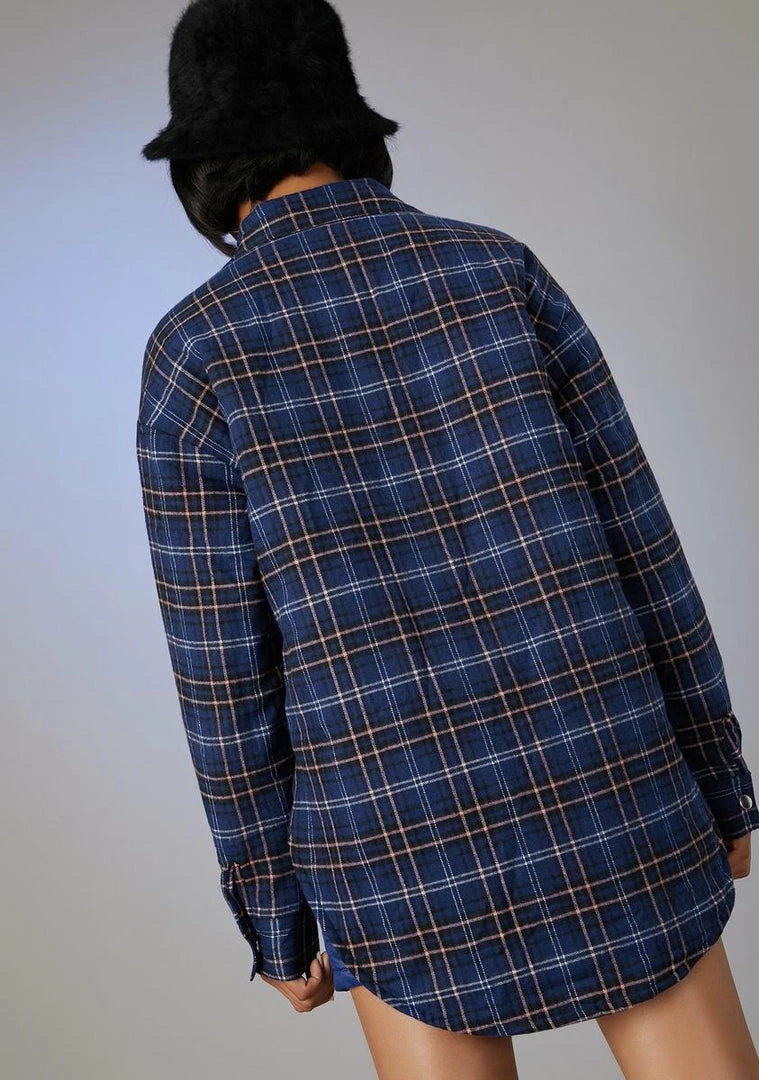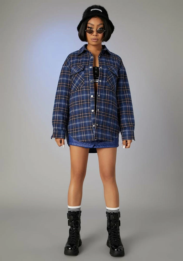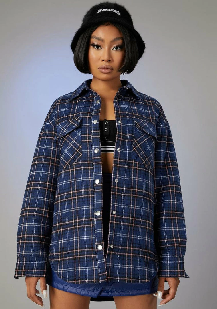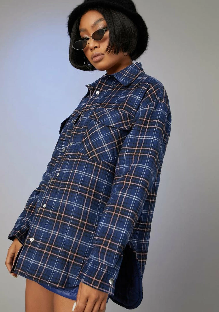 cuz you needed a souvenir. This oversized quilted flannel shacket has button up closures, two chest pockets and a plaid pattern all over.