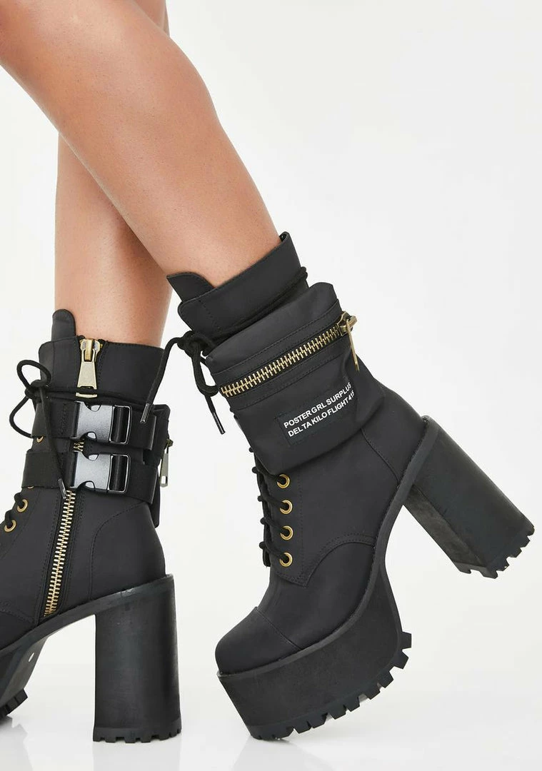 rich with eight figures..thatâs ur type. Give âem bad bish offish vibes in these ankle boots that have rounded toes with upper stitching, front lace up Nâ side zip closures, twinin’ buckle cargo pockets to stash ya shmoney, and stacked treaded soles to look down at ya haterz.
