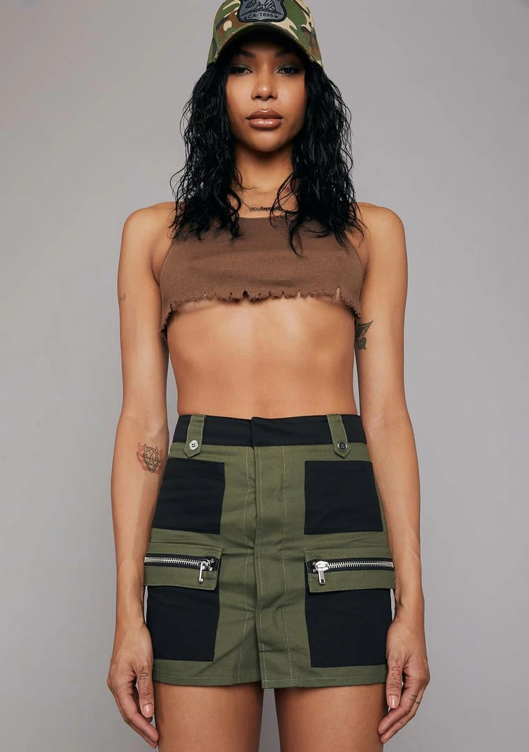 seduction is a sport for you. Bet on it in this canvas mini skirt with a colorblock pocket design, zipper details, buttons, and a zip up front.