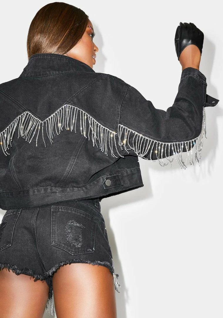 gotcha living your best life with no regrets in sight. Make a scene in this wild denim trucker jacket that has a cropped fit, pointed collar, button up closures and drippinâ rhinestone fringe trim.