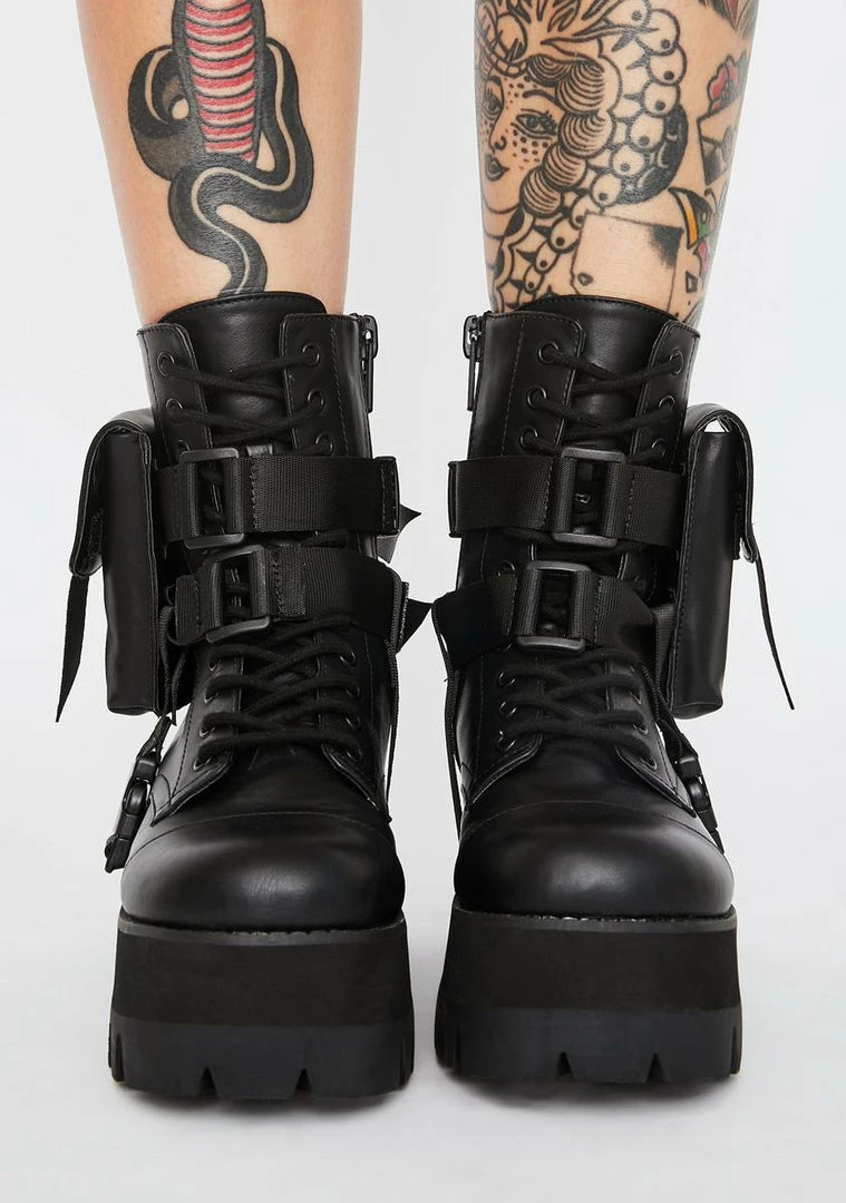 yer the word on the streetz. Call âem out bae Nâ tell âem to @ you in these chunky combat boots that have front lace up Nâ side zip closures, sikk detachable utility pockets Nâ platform treaded soles.