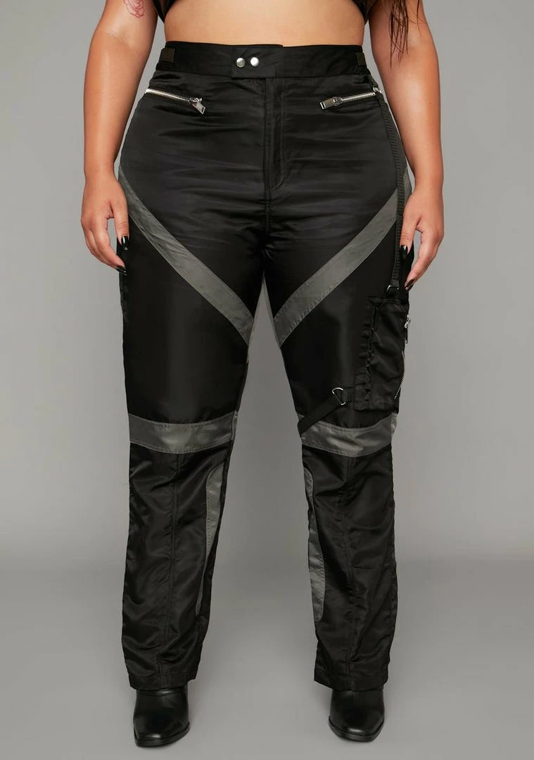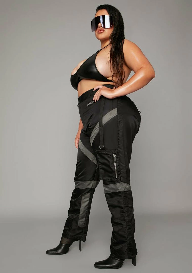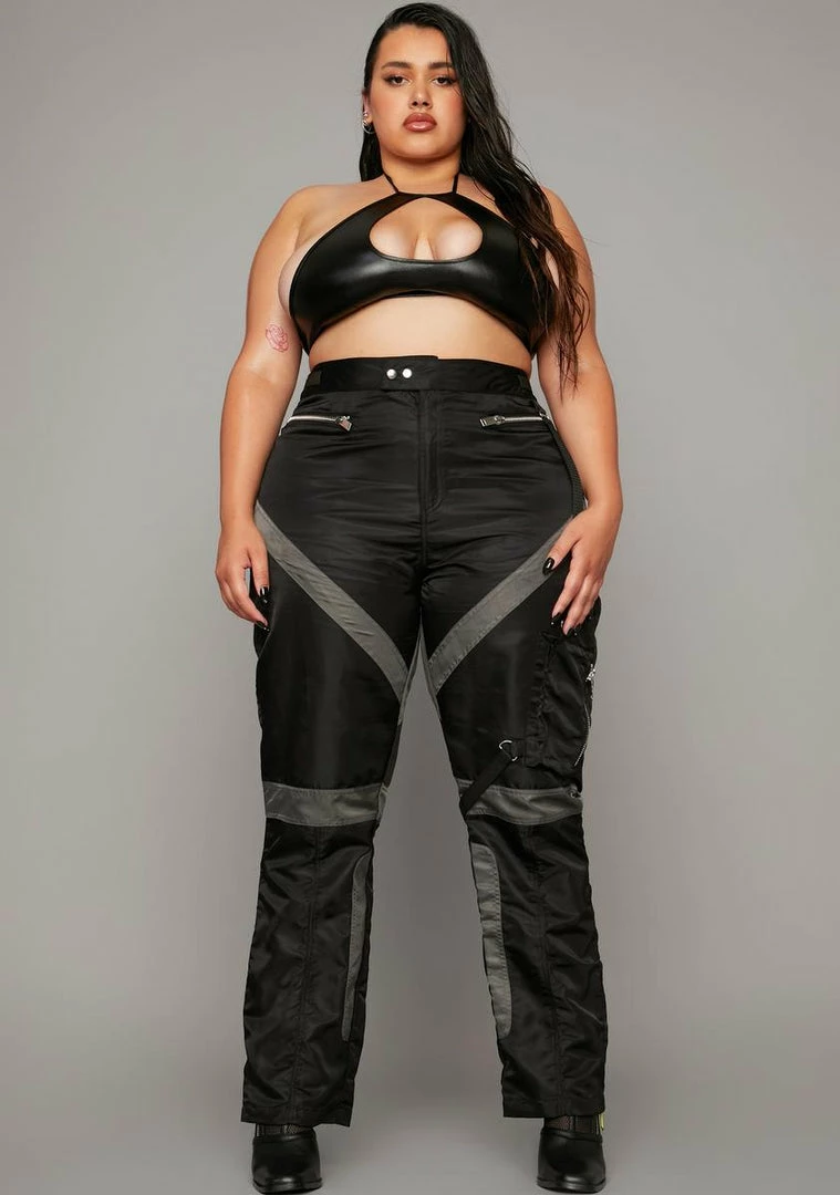 you know how to take the title. These high waisted cargo pants have a straigh leg git, zipper closure, color block panels and cargo pockets all over.
