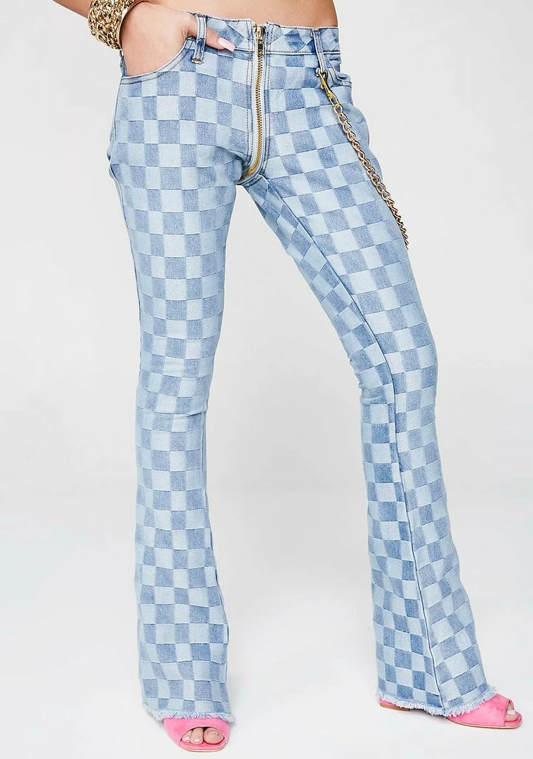 cuz youâre makinâ em happen, bb. Break those necks with these denim bells that have a checkered print all ova, a gold chain detail on the sides, pockets on the front and a zip closure from the front Nâ back.