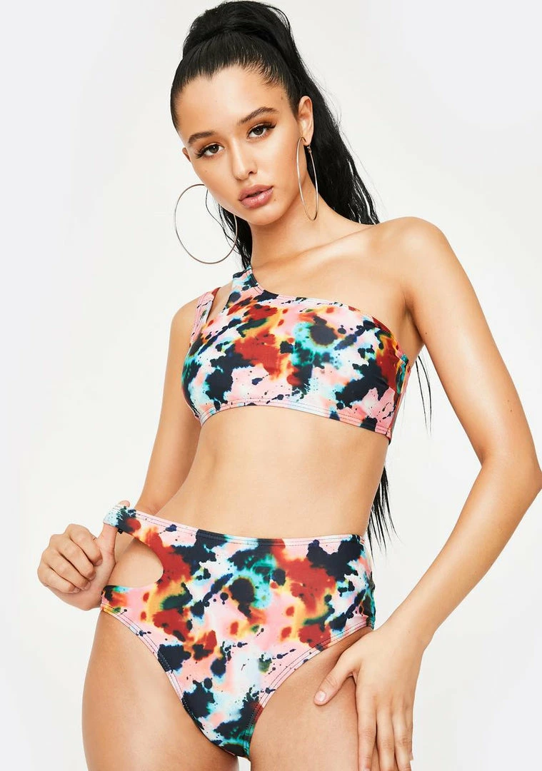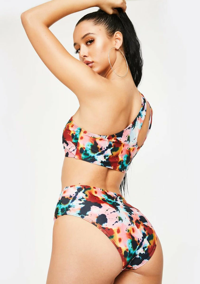 cuz u make em spend that cashhhh bb! Run up tha cabana tab while wearing this supa cheeky tie dye bikini set with a one shoulder bikini top, high waisted bikini bottoms with a side cut out and ink blot print all over.